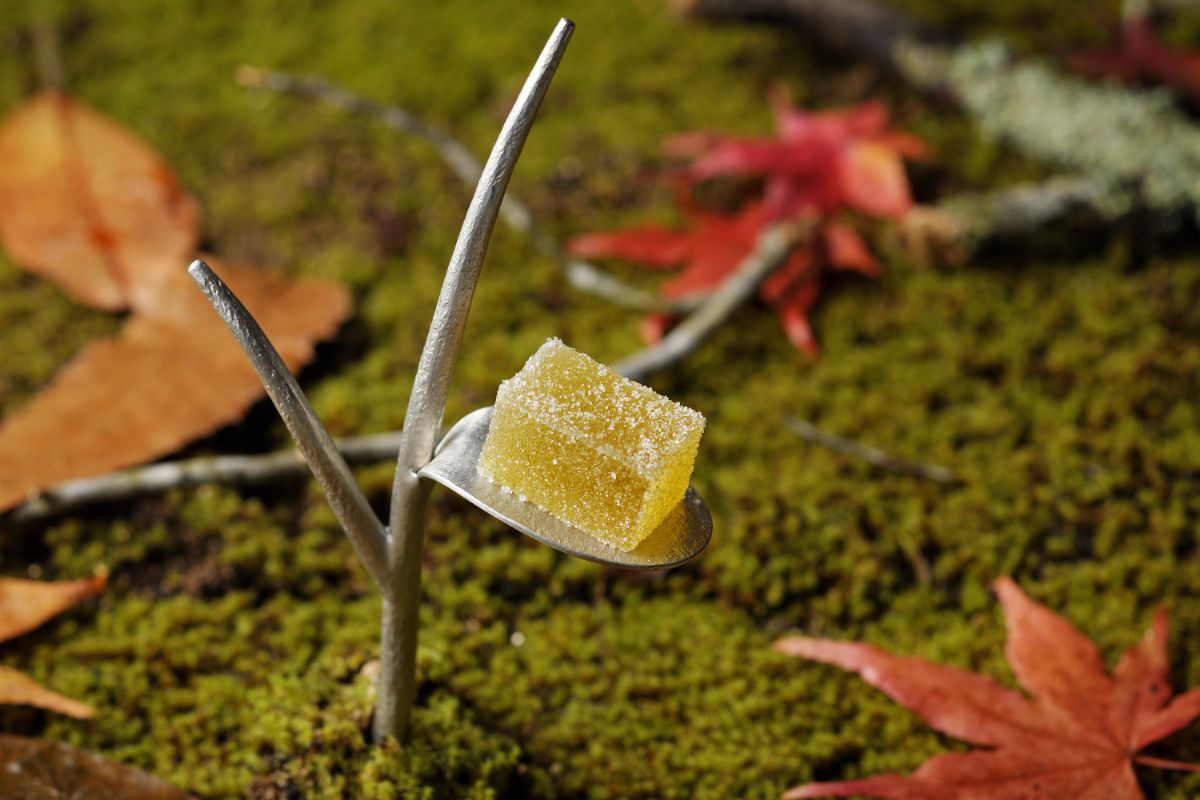 ツキヨタケ:暗い森の中でほのかに青白く輝くツキヨタケの幻想的な色合いを、リンゴ果汁のやさしい甘みで再現したパート・ド・フリュイ