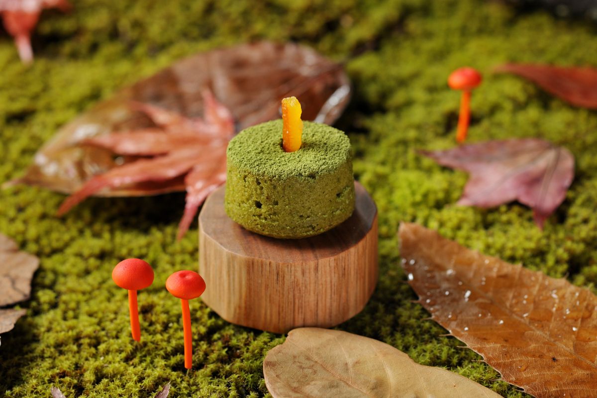 ヒナノヒガサ:苔の上に生えているヒナノヒガサを表現した抹茶のシフォンケーキ