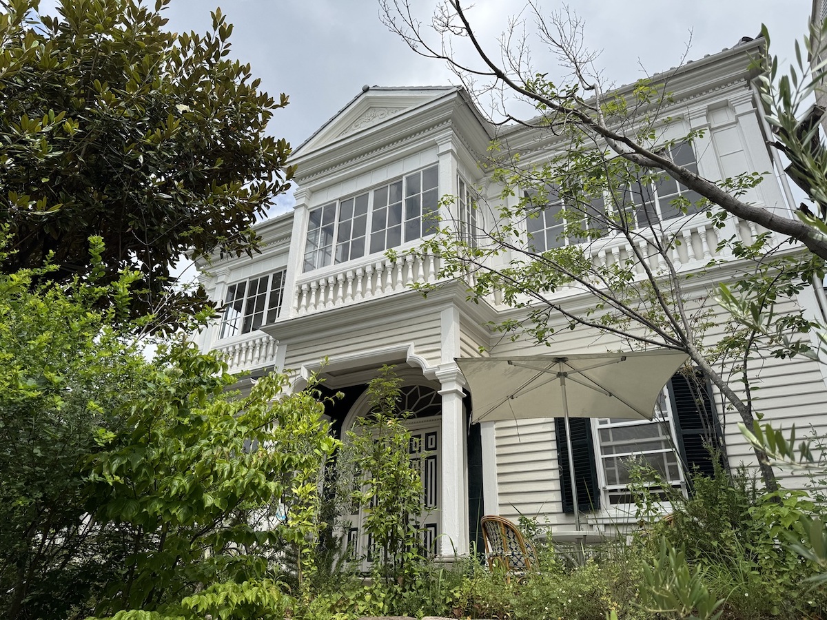 異人館らしい下見板張りの外壁や、ベイウィンドウ (張り出し窓)などを採用したコロニアル様式の屋敷は、現在カフェとして活用されています。「白亜の洋館」ともよばれ、観光ガイドブックなどで紹介されることも多く、観光客はもちろん、地元の神戸マダムたちも愛用する人気店です。