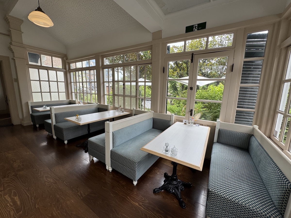 「旧ムーア邸」の一番人気の座席は、こちらのサンルーム。青と白のソファ席もかわいく、窓の外の庭を眺めながら優雅なひとときを過ごせます。