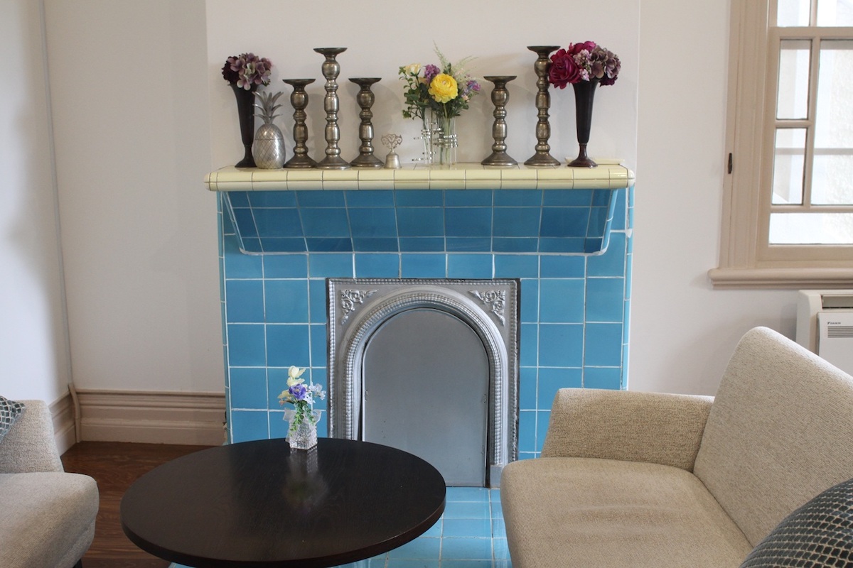 ぜひ注目してほしいのが、入り口右側の部屋にあるブルーの暖炉。邸宅が建てられた当初から残るもので、「改装の時もこの暖炉だけは残してほしい」とムーア氏が言ったというお気に入りの暖炉なのだとか。
