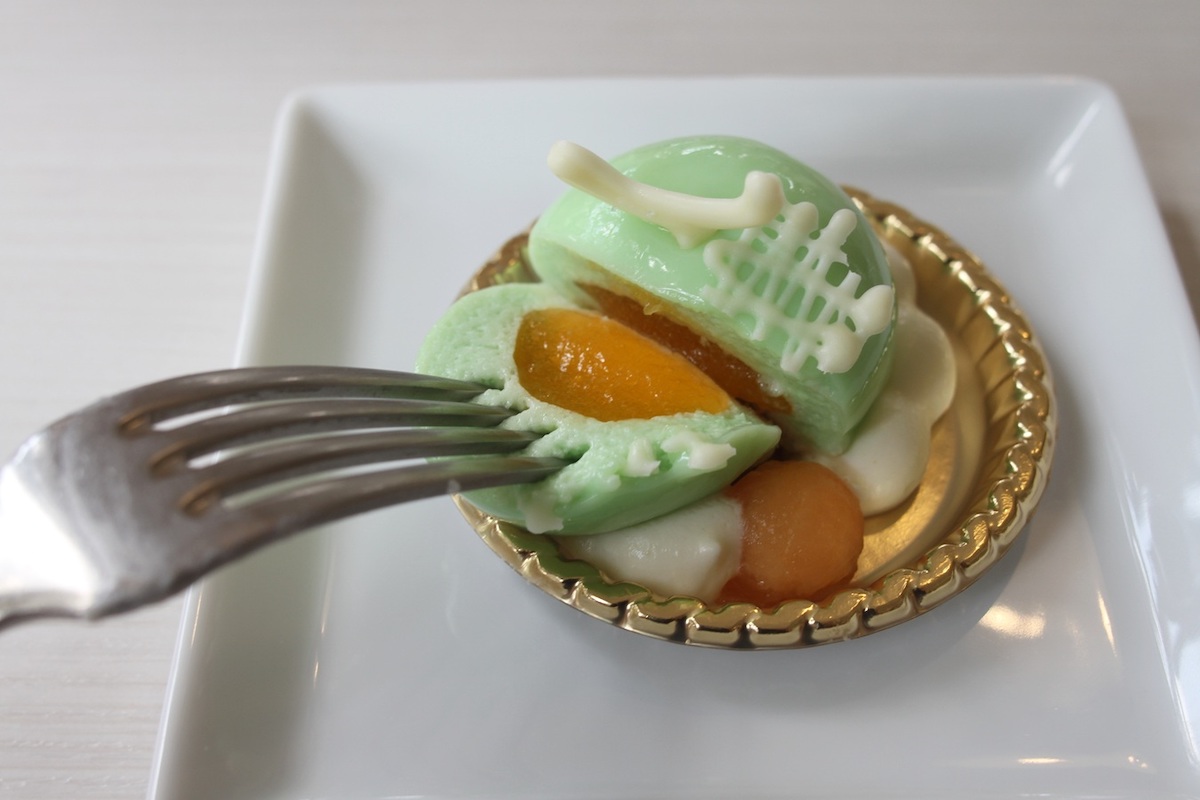 「2色のメロンと杏仁のムース」は、外が青肉のムースに赤肉のソース、杏仁ムースで作られています。中の赤肉ソースはとろりとしていて、メロンの風味がしっかりと感じられるひと品。