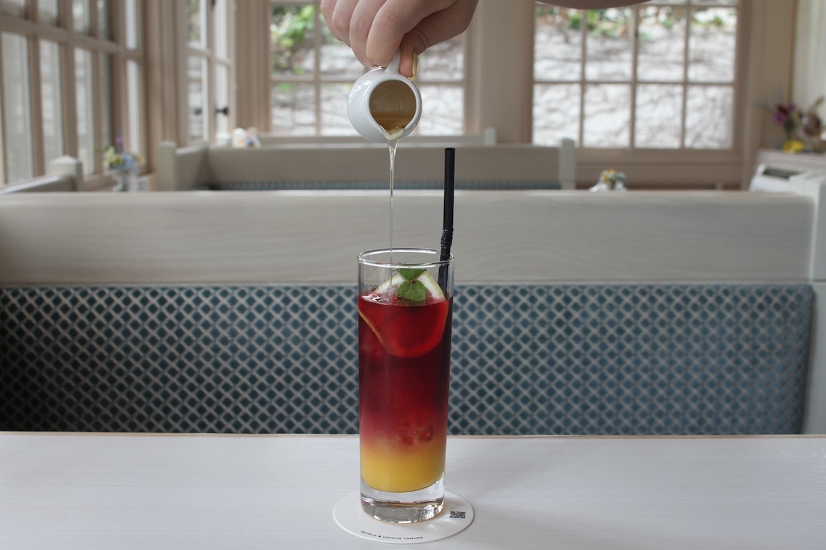 セットのドリンクは、コーヒーや紅茶、ハーブティなどから選べます。今回は、2層の色合いがきれいな「オーガニック・ワイルドベリー・ハイビスカス&オレンジ」をセレクト。さっぱりとした飲み口で、暑い季節にぴったりの飲み物です。
