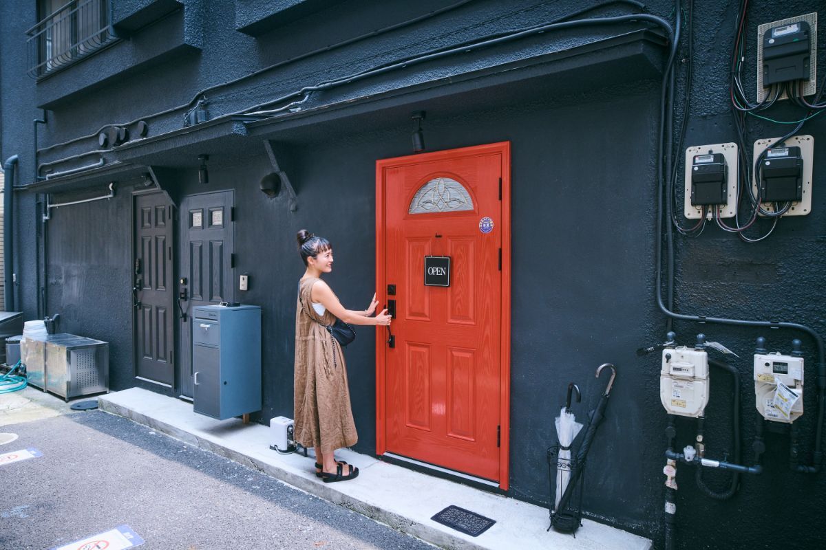 黒塗りの民家に、ひときわ目立つ真っ赤な扉が目に入りました。看板はないけれど、何かがある予感しかしない赤い扉。