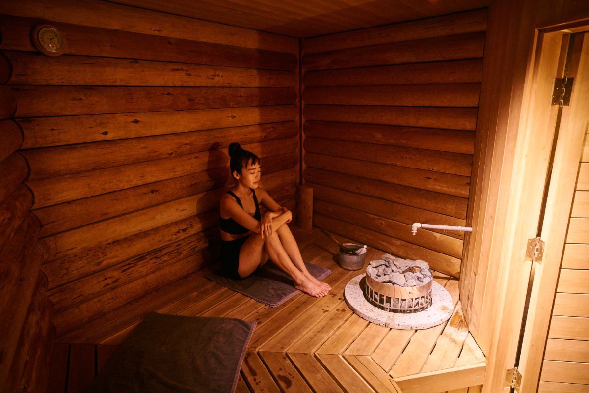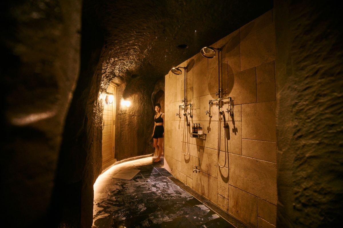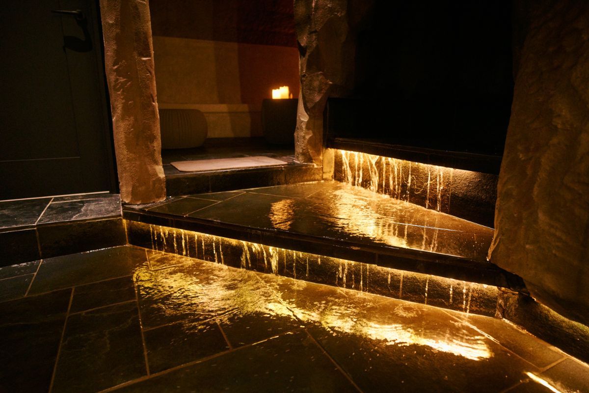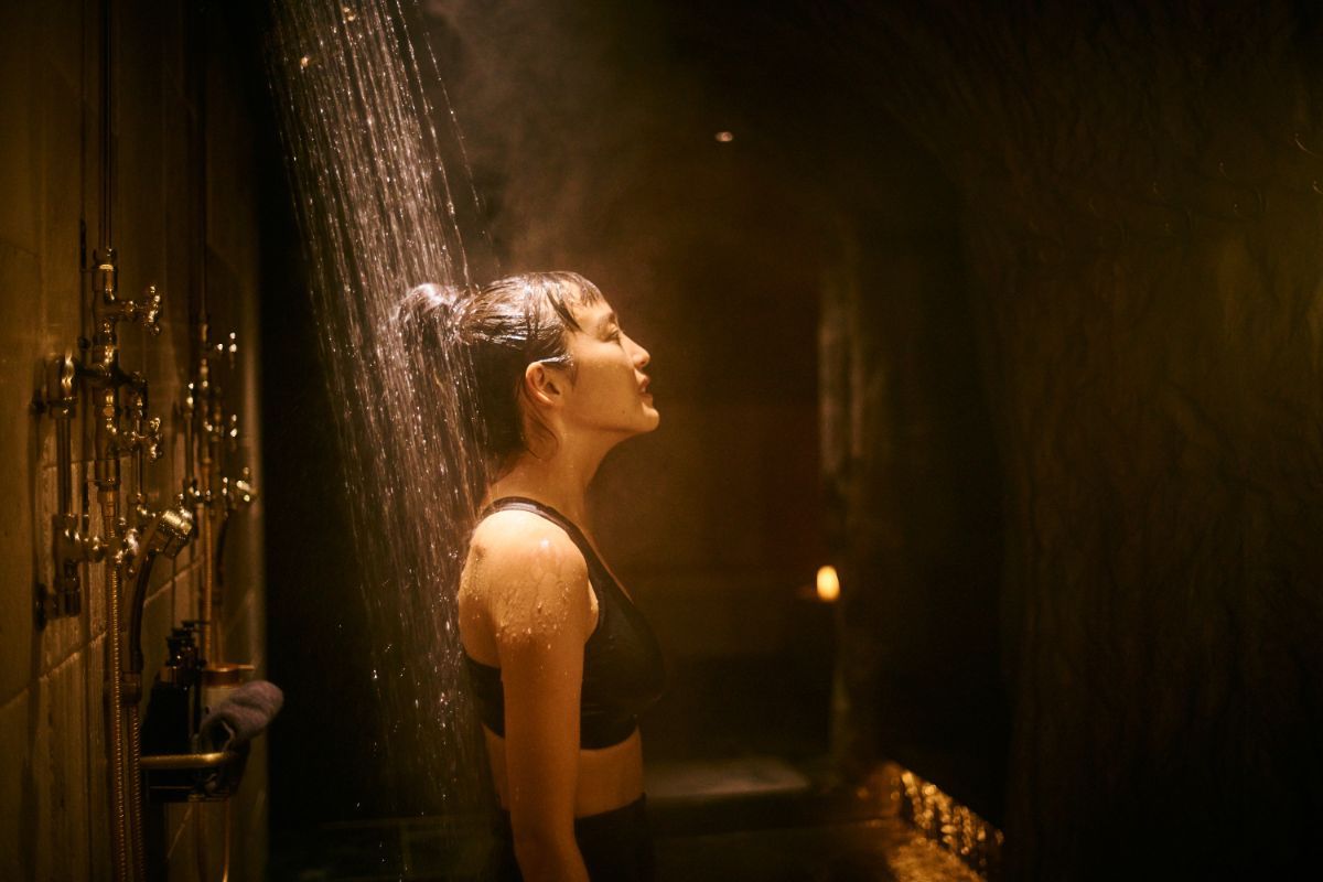 そして、暗がりの中で美しく光るシャワーを浴びて、ゼロ距離にあるサウナへ。