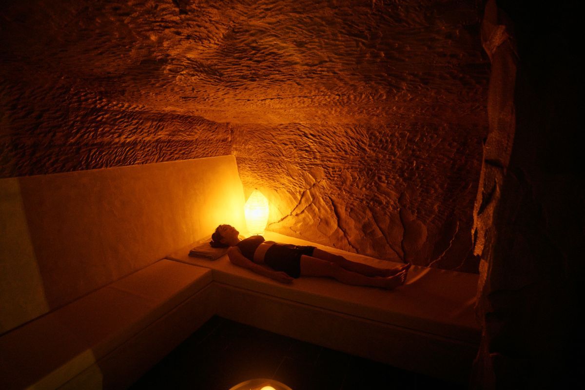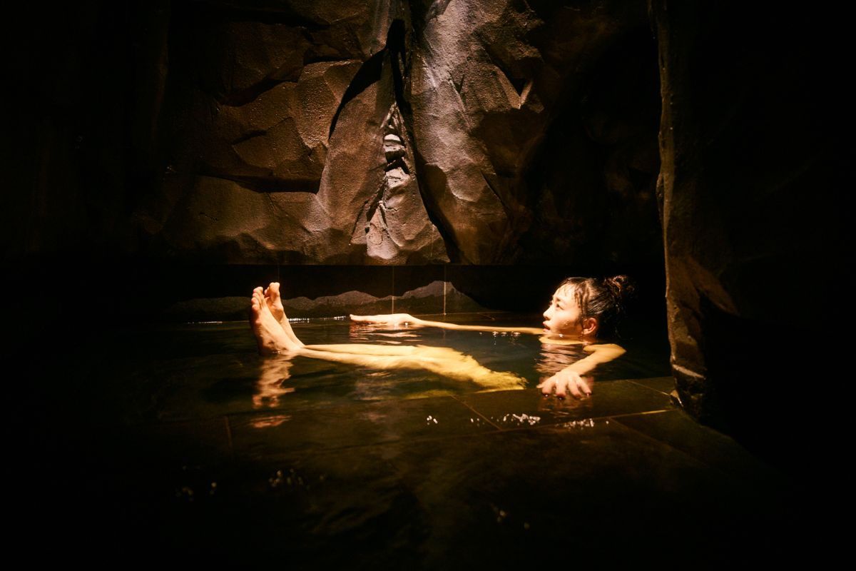 そして、わずかな間接照明で照らされた薄暗い洞穴で休憩タイム。静かで、あたたかくて、洞窟さながらのヒヤッとした冷たさまで演出されているこの空間。