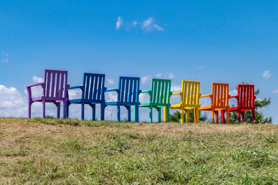 園内を進んでいくと、開けた敷地に7色のカラフルな「虹色の椅子」が! 座って写真を撮ればSNS映え間違いなしの場所です。ほかにも上野ファームには、ブランコなどの写真スポットが点在しています。