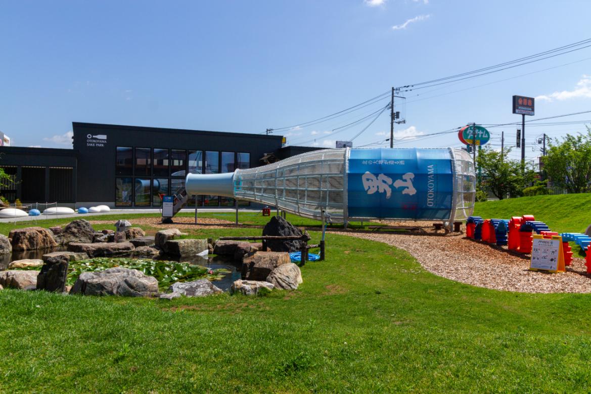 建物の外にある、大きな一升瓶がインパクトのある「おちょこ広場」。この一升瓶、全長が12mあるすべり台なんです。