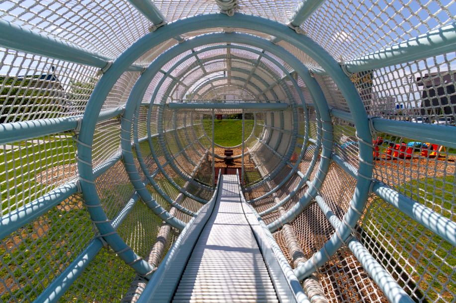 瓶の口から入って中へと滑ることができます。また、裏側からは、中段に設置したネットに登ることも!