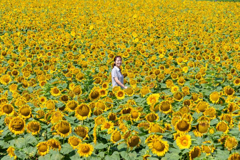 23ヘクタール(東京ドーム約5つ分)という広大な土地に、17~18種類のヒマワリが約200万本植えられています。見頃は例年7月下旬から8月上旬ごろですが、広い会場内ではエリアごとに開花時期をずらしているため、ひまわりまつりの開催期間中はいつ訪れてもどこかで美しいひまわりが楽しめるように工夫されています。