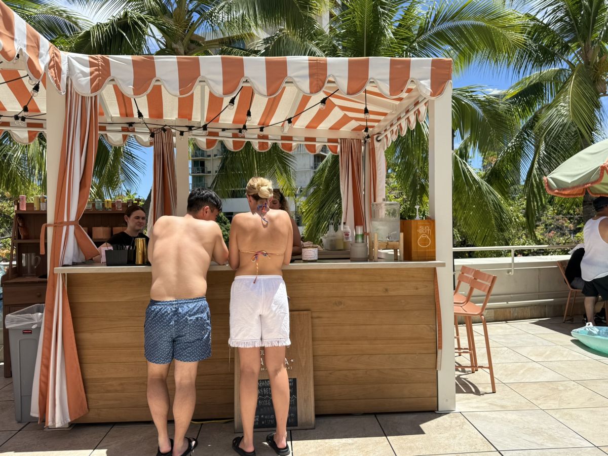 写真映え抜群! ピンクオレンジのパラソル&ストライプカバナが彩る、ワイキキの“映えるプールスポット”