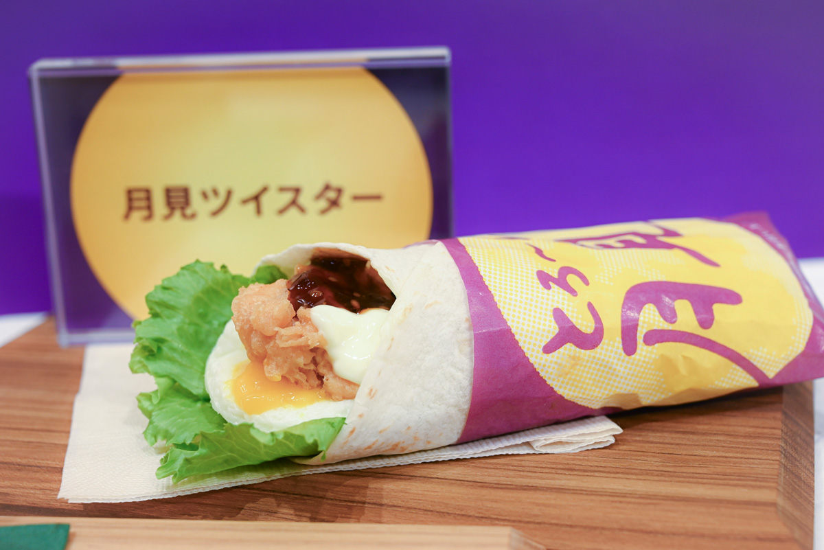 カーネルクリスピーとレタスに、“とろ~り”目玉焼き風オムレツ、甘辛のてりやきソースと特製マヨソースを合わせて、トルティーヤで包んだ「とろ~り月見ツイスター」(単品480円、セット890円、よくばりセット1190円)。