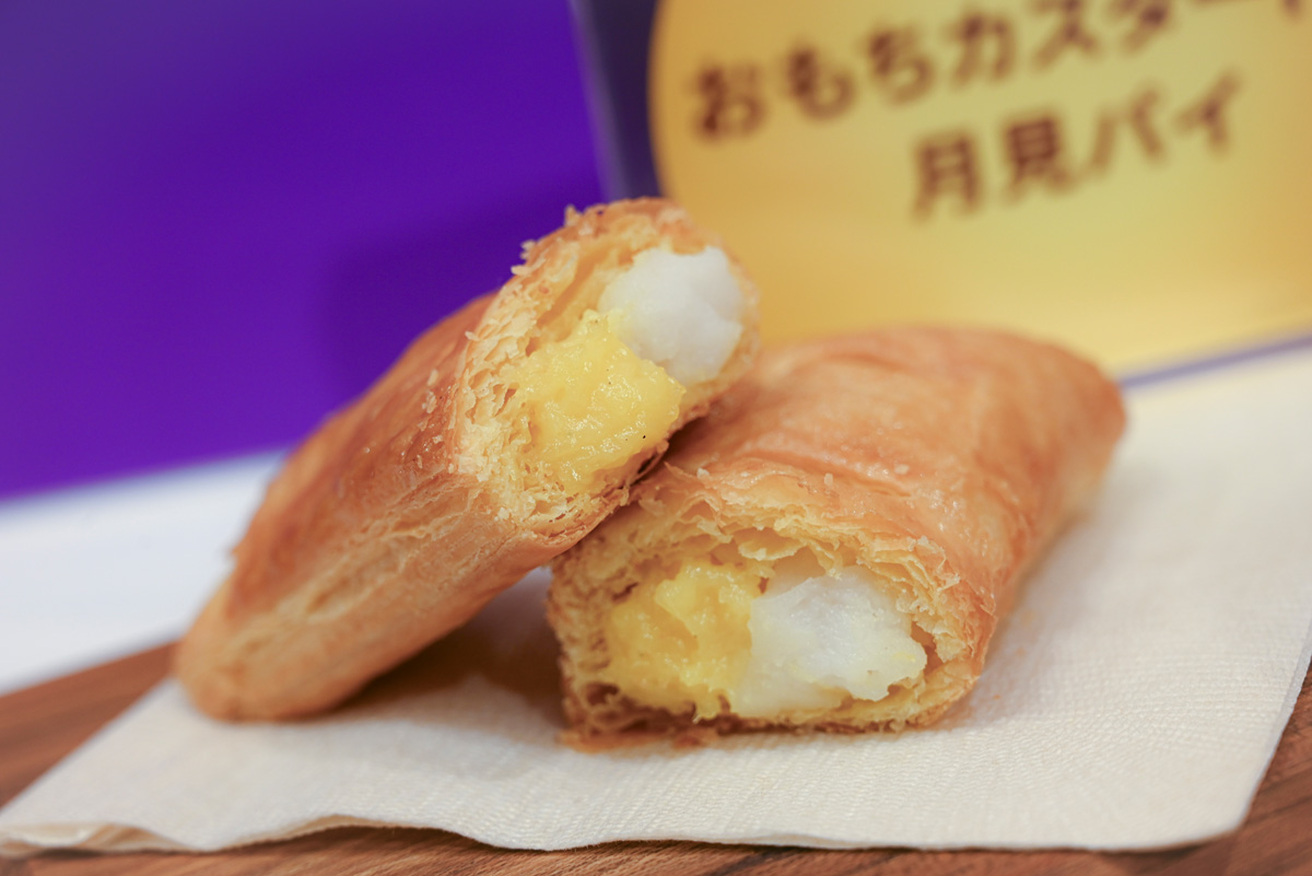 もちもち食感のおもちフィリングと、“とろ~り”濃厚なカスタードクリームをサクサクのパイ生地で包んだ「おもちカスタードの月見パイ」(単品300円)。