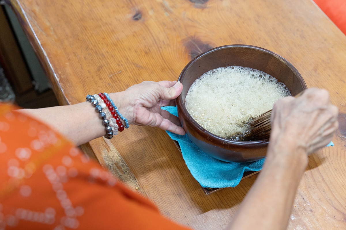 大きな鉢に入ったお米の煮汁を、茶せんで泡立てていきますが、上手に泡立てるコツは一定のリズムで左右にシャカシャカと混ぜること。手を止めず、2分ほど泡立てるとキメの細かいキレイな泡が完成します。