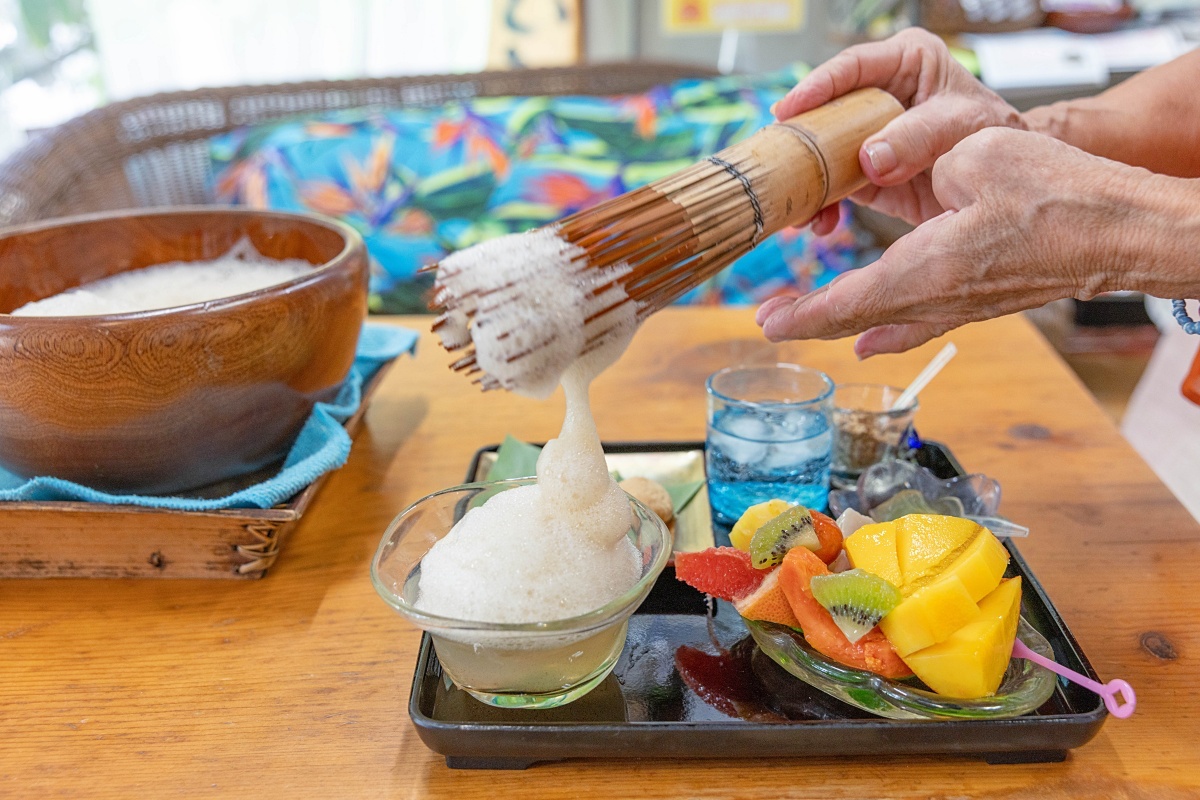 ぶくぶく茶が復元したことで現在は沖縄県内で味わうことのできるお店がいくつかありますが、多くのカフェや茶屋ではぶくぶく茶をすでに泡立てた状態で提供するため、泡を立てるところから体験できるのは「ぶくぶく茶 嘉例」のみ。
