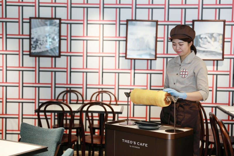 好評の「THEOくんのバウムクーヘン食べ放題」2970円では客席まで焼き立てをワゴンで運んで、目の前で好きなだけカットしてくれます。