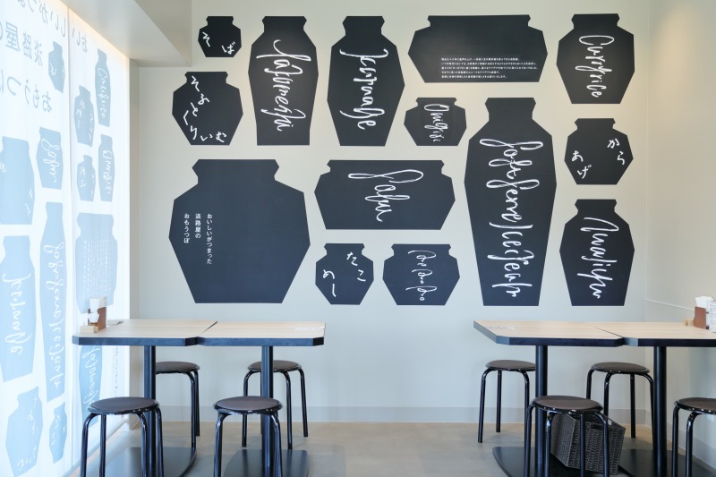 たこつぼ容器をテーマにしたメニューを展開している1F「淡路屋のおもうつぼ(蕎麦とめし処)」では、店内の壁に大小さまざまな大きさ・形の壺が描かれており、とてもユニーク!