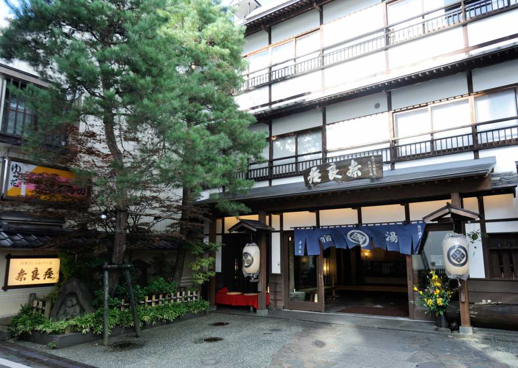 温泉街の中心にある湯畑から徒歩1分ほどの「奈良屋」は、明治10年(1877)に創業した老舗宿。風情ある木造建築に「湯宿」と書かれたのれんがかかり、温泉情緒たっぷりです。