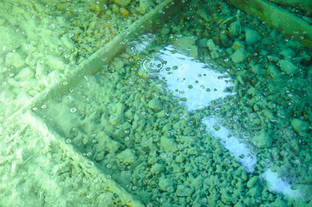 湯畑の隣にある白旗源泉は、お湯が湧いているところを見ることも。その源泉から自然の傾斜を利用して引いた湯を、奈良屋では一晩寝かして温度を下げて、酸度が高い湯を落ち着かせマイルドにしているのだそう。