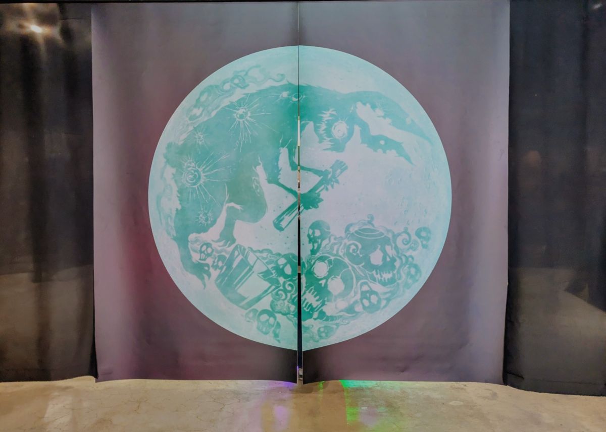 会場にはキャラクターとともに写真を撮れるフォトスポットが多数用意されています。撮影禁止マークが貼られているところは撮影しないように注意しつつ、編集部の推しスポットをいくつかご紹介。2コース共通の箇所だけとなること、ご容赦ください。ちなみに、こちらは入り口にかかる暖簾。映画で印象的に登場していた、あの月です。