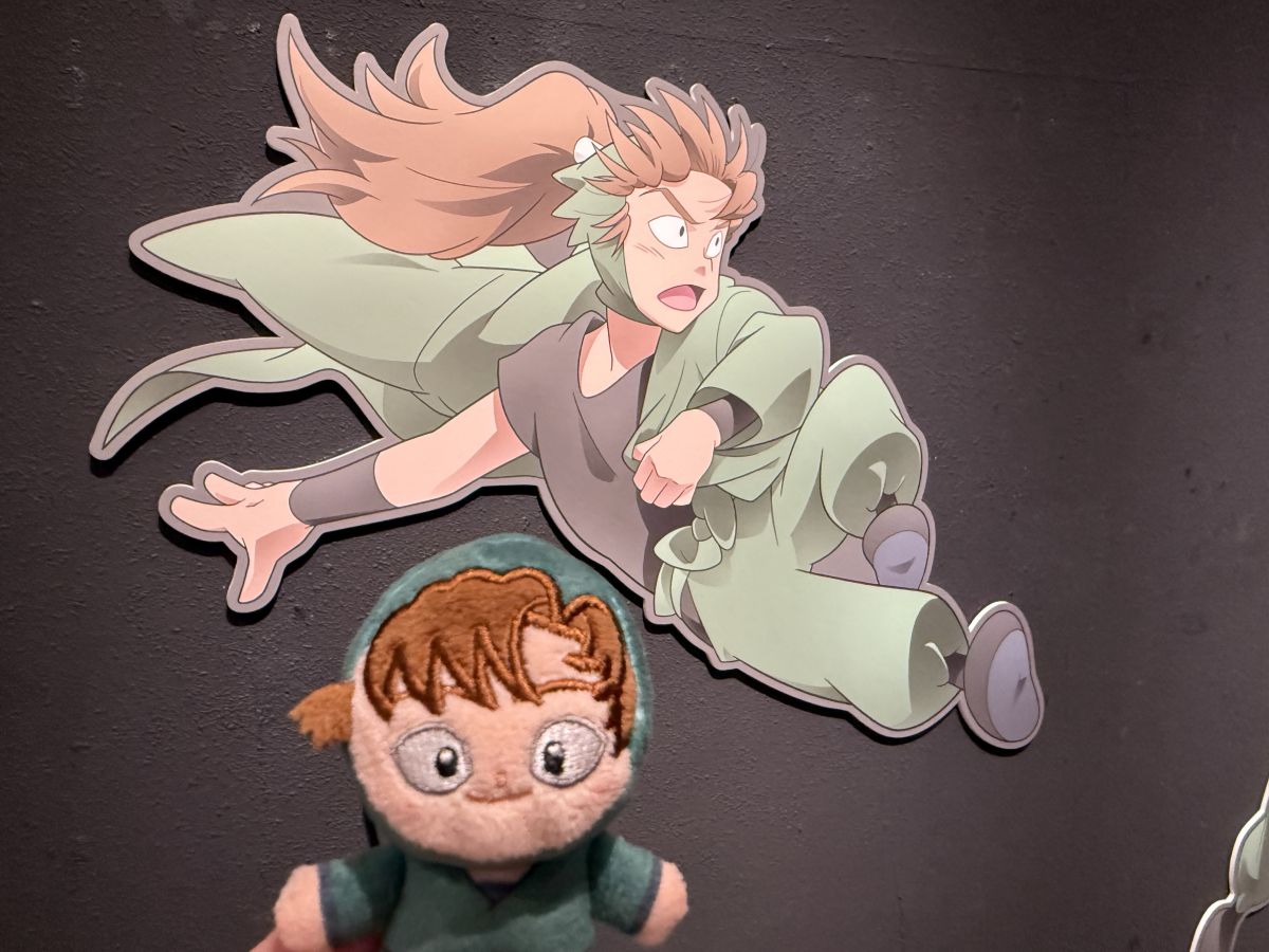 体験エリアにある、六年生たちの展示コーナー。思わず持参したぬいとともに撮影!ここは善法寺伊作、食満留三郎、中在家長次、七松小平太の4人がいました。