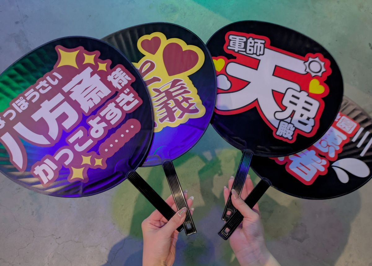 原画展示エリアにある、稗田八方斎と天鬼のコーナーには「八方斎様かっこよすぎ」などの文字がデコられた推し活うちわが用意されています。天鬼の隣に立って撮影も可能です。