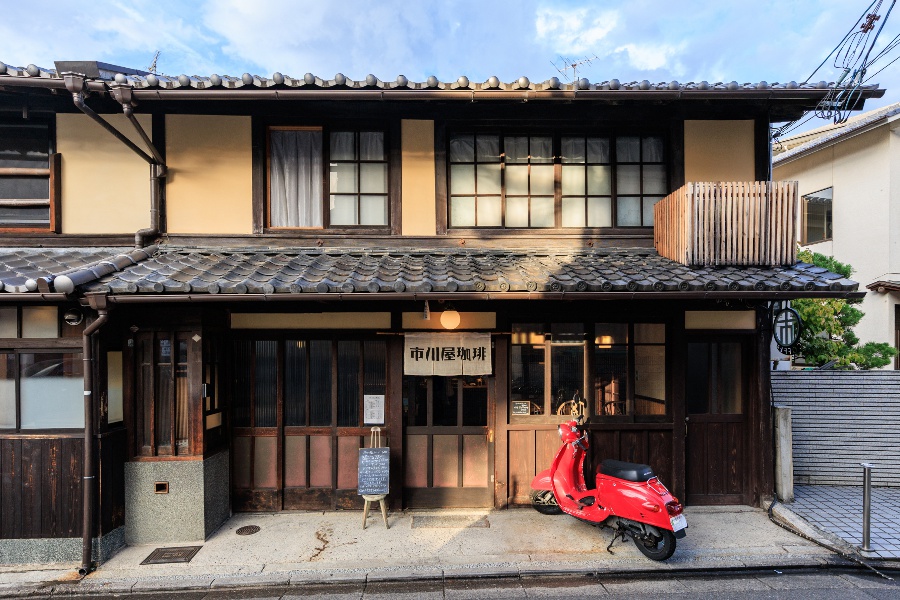 京阪清水五条駅から徒歩10分ほどの場所にある「市川屋珈琲」。京都・清水焼の発祥地として知られる五条坂界隈に佇む喫茶店です。店舗前の道は、歴史ある渋谷街道。三条通りと並び、平安時代の主要道路であったと言われています。
