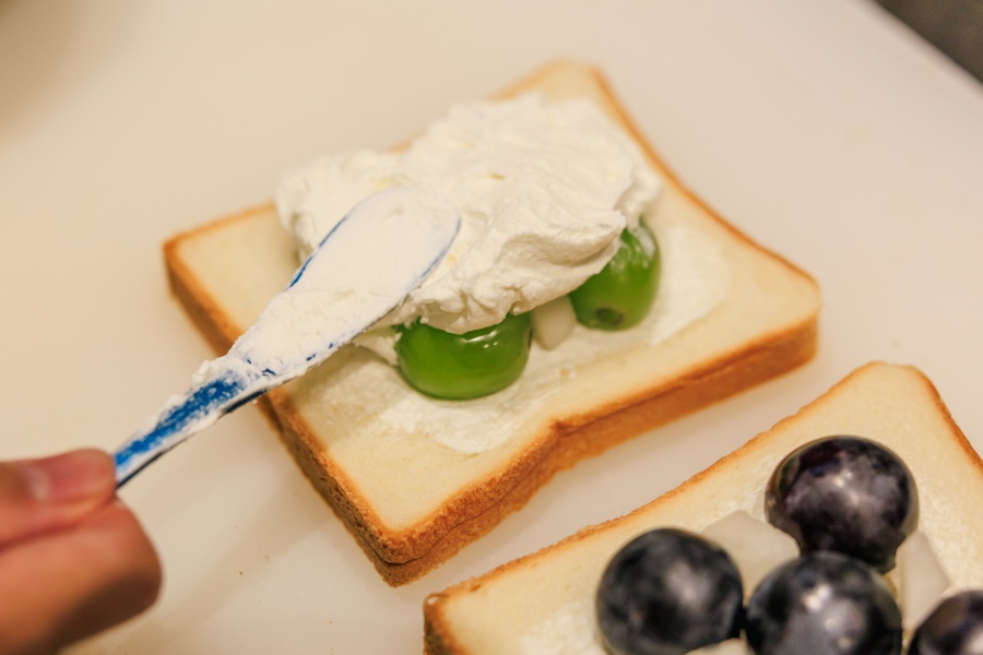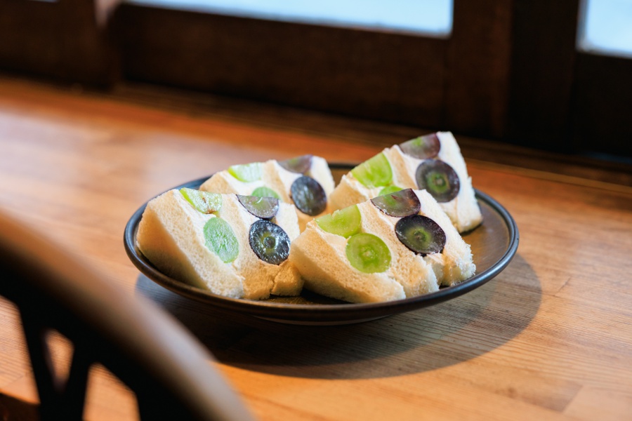 看板メニューは、「季節のフルーツサンド」。旬の果物と生クリームがたっぷり詰まった大人気の一品です。フルーツはその時期に一番よいものを使用。この日は、秋限定のシャインマスカットとピオーネ、梨のサンドをいただきました。みずみずしい2種類のブドウに、梨のシャキッとした食感がよいアクセント。生地とフルーツ、生クリームがどれも絶妙にマッチし、最後までぺろっと食べ進められます。