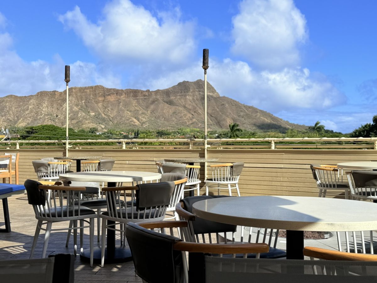 客室からはダイヤモンドヘッドを間近に望むことができますが、もちろん、プールからの眺めも素晴らしく、プールからも驚くほどの近さでダイヤモンドヘッドを望めます。プールはレストラン「デック」と同じ3階のフロアにあります。