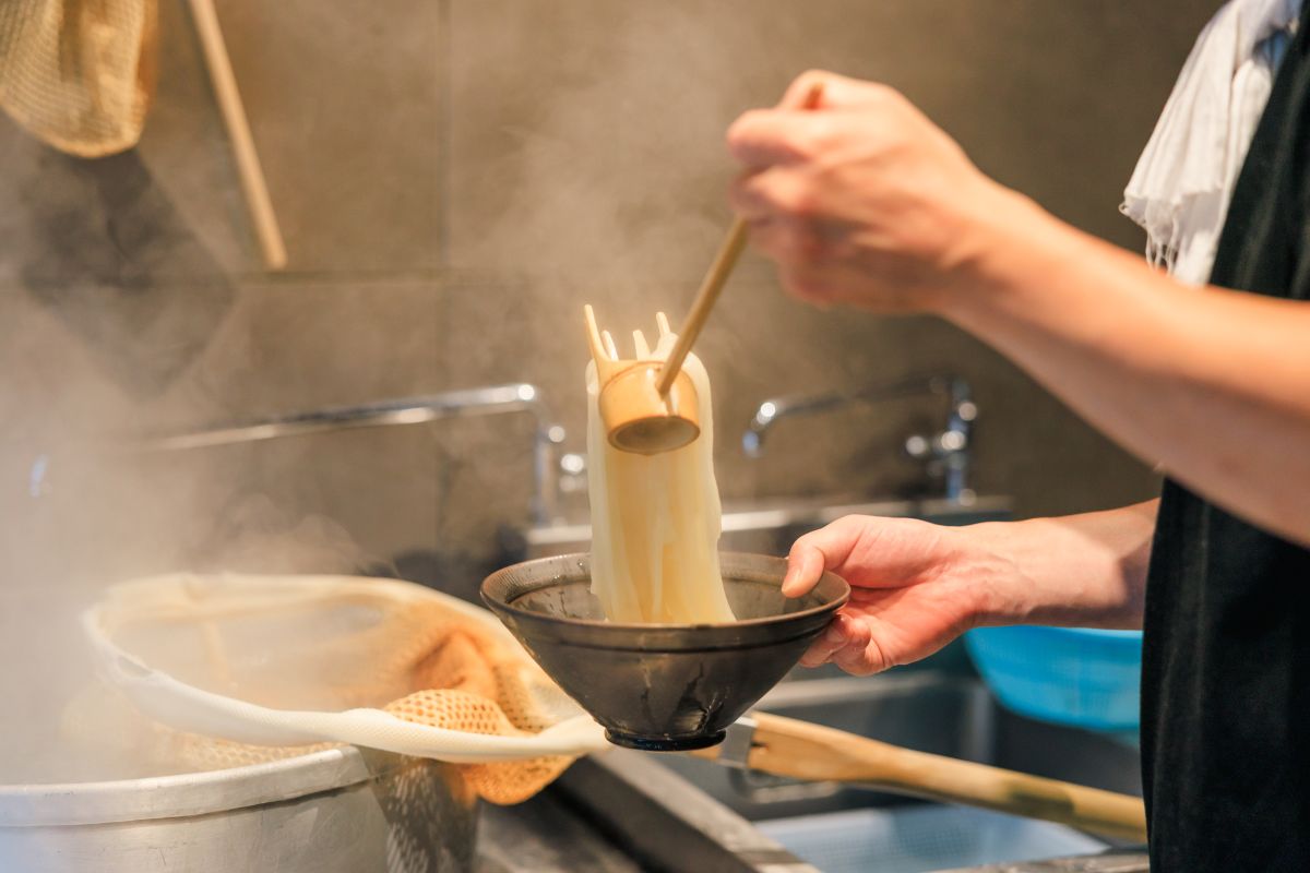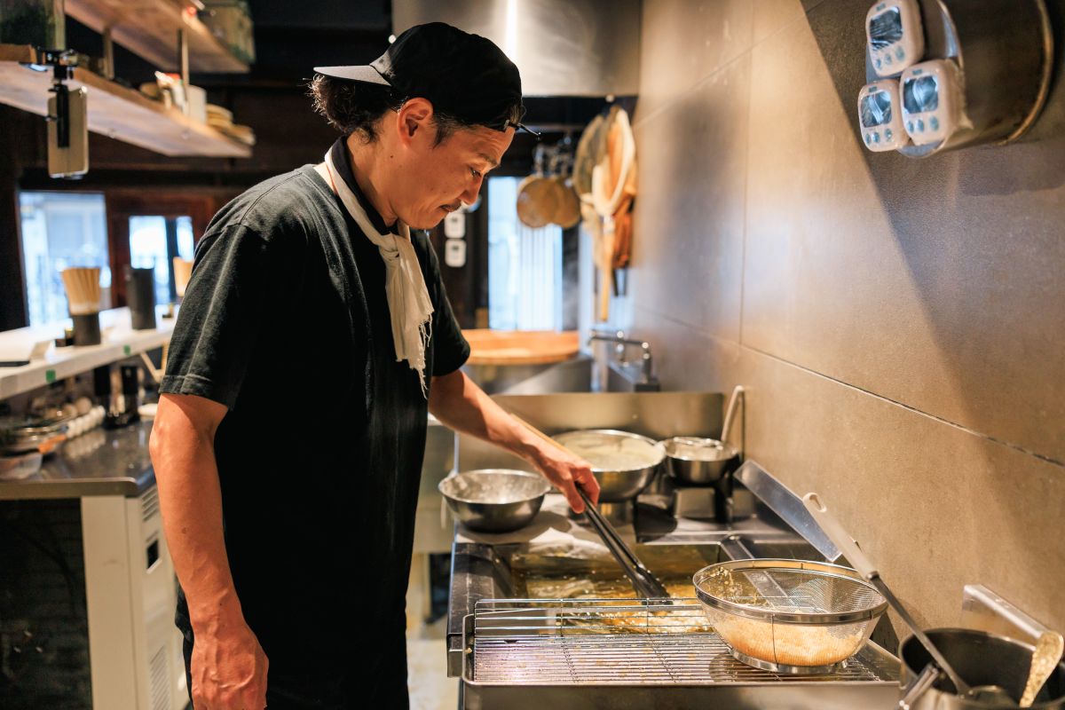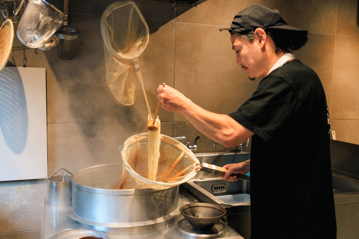 うどんは毎日店内で打つ自家製で、小麦粉・水・塩というシンプルな素材だからこそ、技術と感性が試されます。青木さんは季節や気候に合わせて配合を微調整し、常に最高の状態で麺を提供。