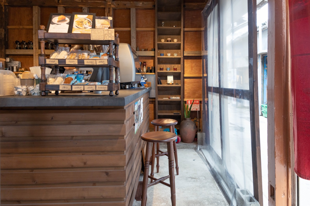 古い木造建築をリノベーションした店内は、数名が並んで座ることのできる椅子とカウンター2席のみ。素朴で飾らない雰囲気が魅力的です。