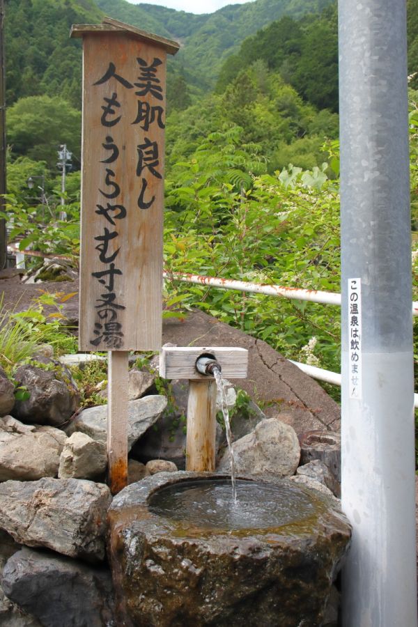 寸又峡温泉は、pH8.9のアルカリ性単純硫黄泉。少しぬるっとする手ざわりで、わずかに硫黄臭を感じられます。肌の古い角質を取りのぞき、肌を引き締める効果があるとされ、「美女づくりの湯」ともいわれています。