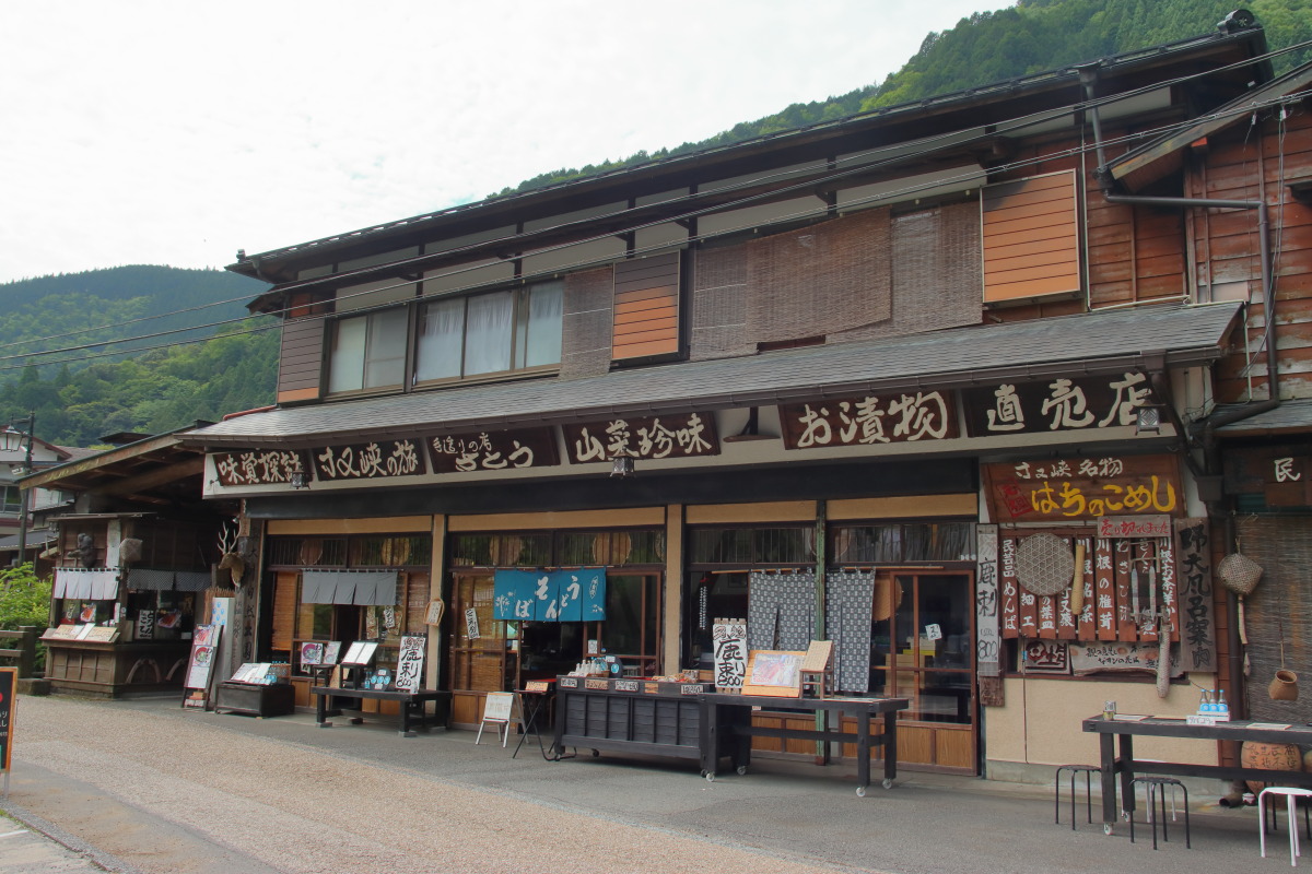 温泉街の最奥、夢のつり橋へと続くプロムナードコースの手前にあるのが、食堂兼みやげ処の「手造りの店さとう」。昭和37年(1962)から続く老舗で、そばやうどんをメインに、おしるこなどの甘味も提供しています。