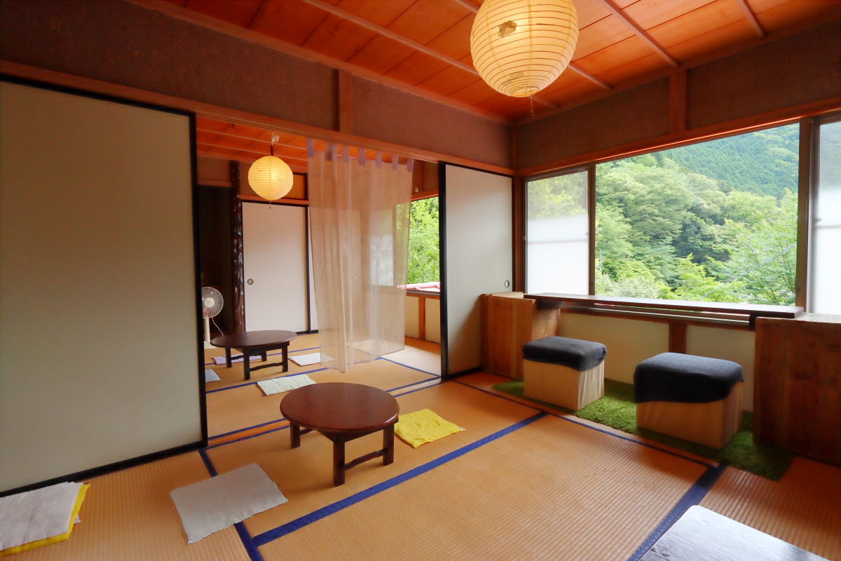 店内の奥と2階はカフェスペースになっています。写真の2階の部屋は畳敷きで子ども連れにもおすすめ。窓からは、寸又峡の山々を望むことができます。