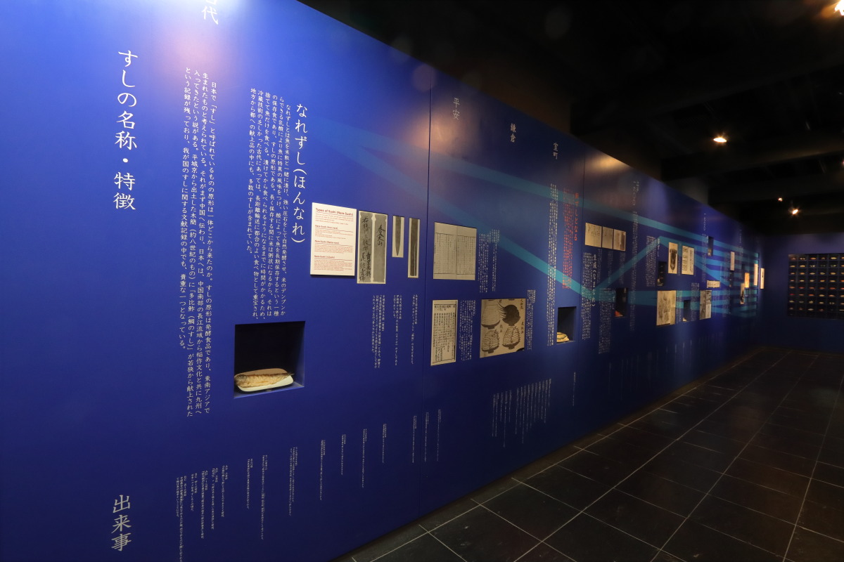 ミュージアムの最後を締める「鮨学堂(すしがくどう)」コーナーでは、日本に伝来してきた古代からの寿司の歴史や、日本各地の寿司文化、駿河湾の漁業などを学べます。
