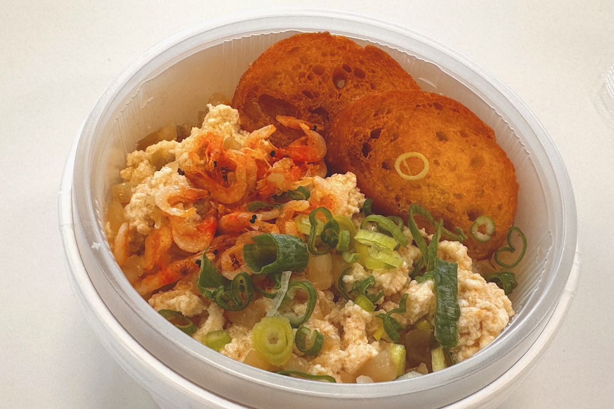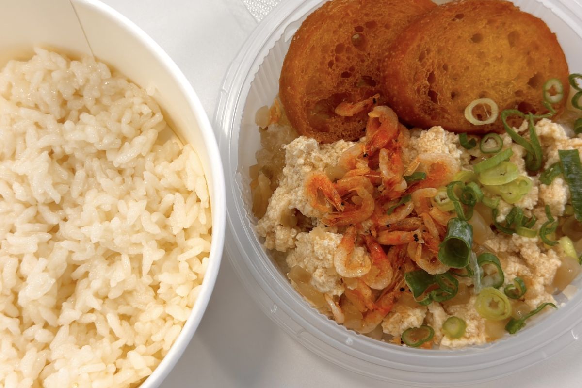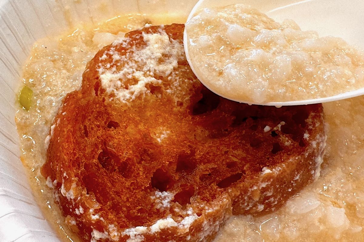 とろ〜んとした食感のお粥に、桜海老やごま油の香ばしさがアクセントに。揚げたバゲットは、お粥に浸してとろんとした部分と、揚げた香ばしさが残るカリッとした部分の両方が楽しめます。台湾旅行に行った気分で、朝食に食べたい一品です。