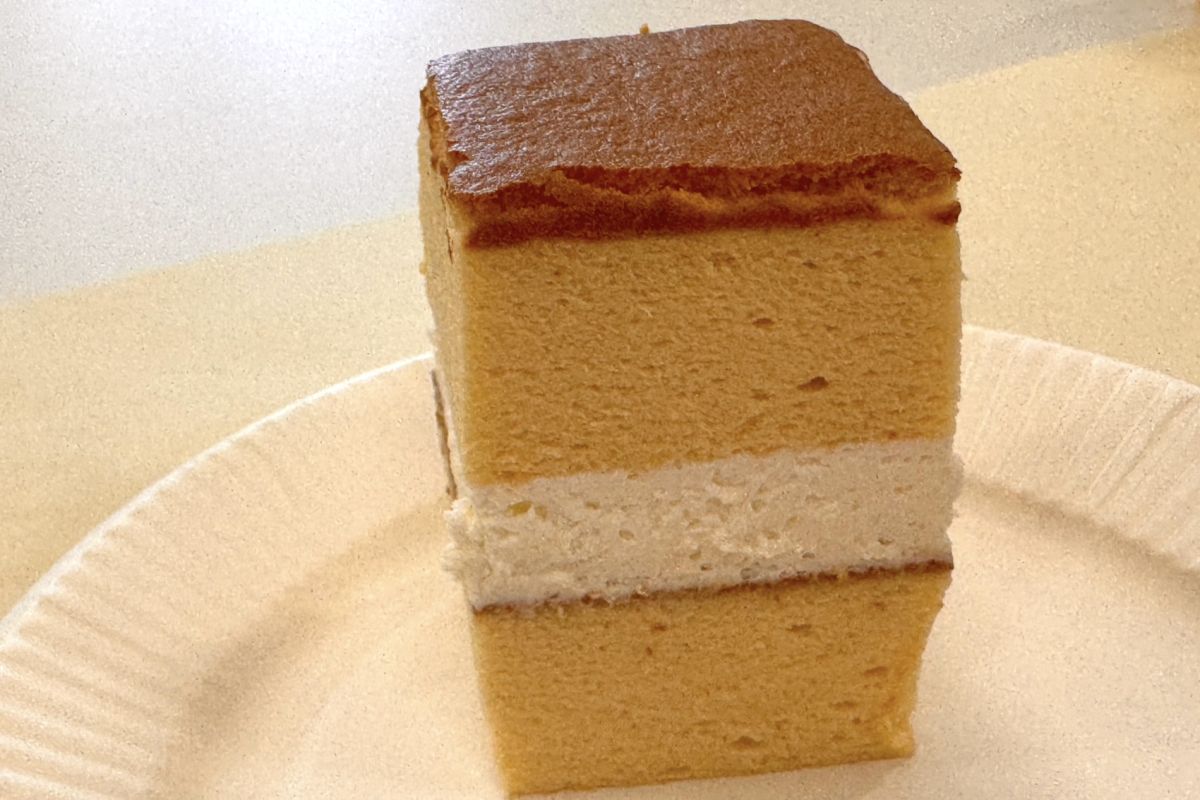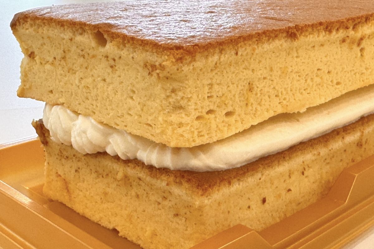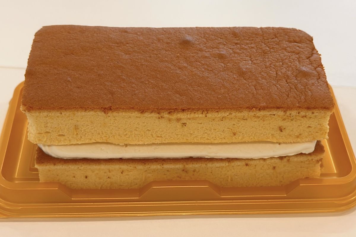4番目にご紹介するのは、台湾スイーツの定番「台湾カステラ」にクレームシャンティ(甘みを加えた生クリーム)を挟んでアレンジした「成城石井自家製 アカシア蜂蜜の台湾風バニラカステラ」1394円。大きさは幅15×奥行7×高さ5cmほどとボリュームがあり、切り分けていただきます。
