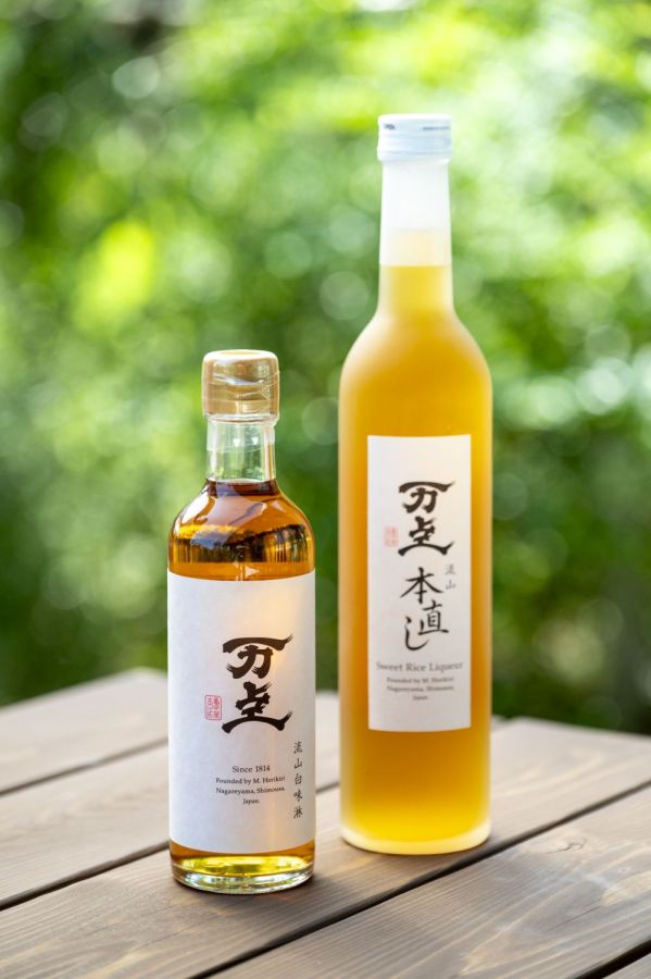 こだわりの逸品や地元ならではのグルメ、雑貨などを取りそろえたショップ「ながれやまぐるり」。もちろんこちらでは白みりんを使った商品が大人気です。万上の純米本みりん(左:「万上流山白味淋」1100円)や、みりんベースのほんのり甘いお酒(右:「万上流山本直し」1980円)はみりん発祥の地である流山らしい商品です。