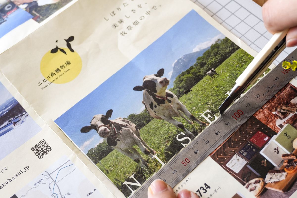 さらに、現地でもらったパンフレットなどから素材を切り抜いて貼るのも、その場の空気や楽しさを残すひと工夫。今回はニセコ高橋牧場のリーフレットを使用。「NISEKO」の地名や羊蹄山、牧場の写真など、その場所らしさを感じられる部分を選んで切り抜きました◎