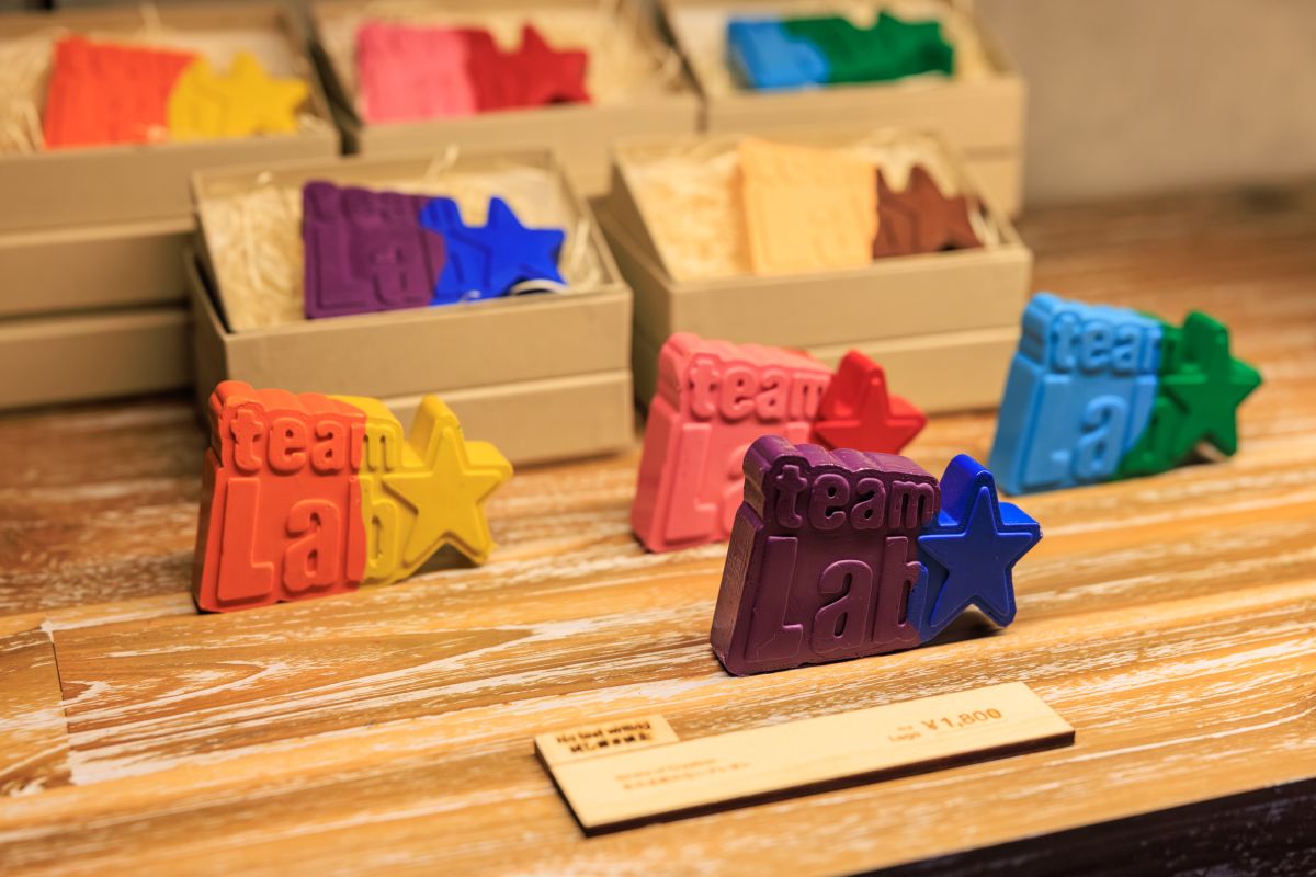「スケッチファクトリー」の出口付近にはグッズコーナーも。短くなり、使えなくなったクレヨンを再利用して作られた、色の名前のないクレヨン ロゴ型+箱セット1800円は、一つ一つ手で作っているため、同じものは二つとない、世界に一つだけのクレヨンです。ほかにも、ステッカーやオリジナルのティーバッグ、米袋を再利用したノートPCスリーブなどチームラボならではの独自の目線で作られたグッズが並びます。