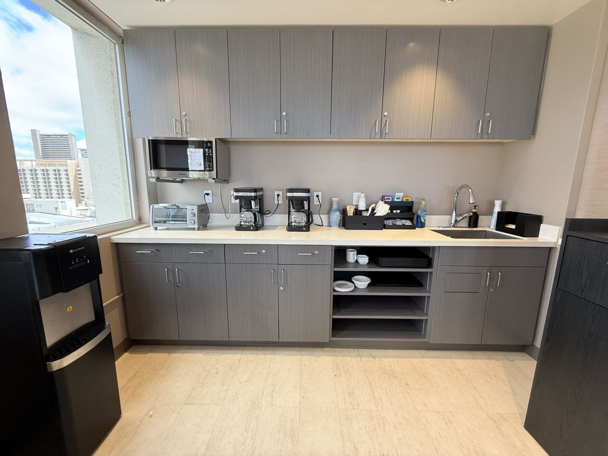 カフェスペースには電子レンジやトースター、コーヒーメーカーが完備されており、長期滞在や軽食利用にも便利です。朝のひとときや小腹が空いたときなど、自由に利用できる空間。