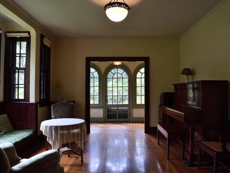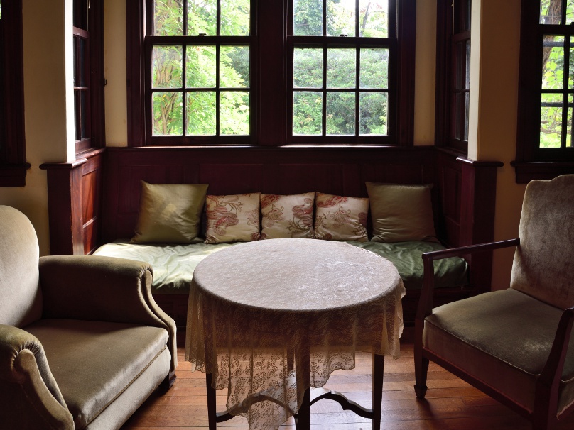 まずは主棟の1階を見ていきます。夫妻がくつろぎの時間を過ごした居間には、ヴォーリズ建築では欠かせない暖炉がありません。その代わりに自然光を取り込める窓を東側に、サンルームを南側に設けているため、温かな空間となっています。東側の窓には作り付けのソファがあり、駒井博士はこれに腰掛けて静江が弾くピアノをじっくりと聞いていたそうです。