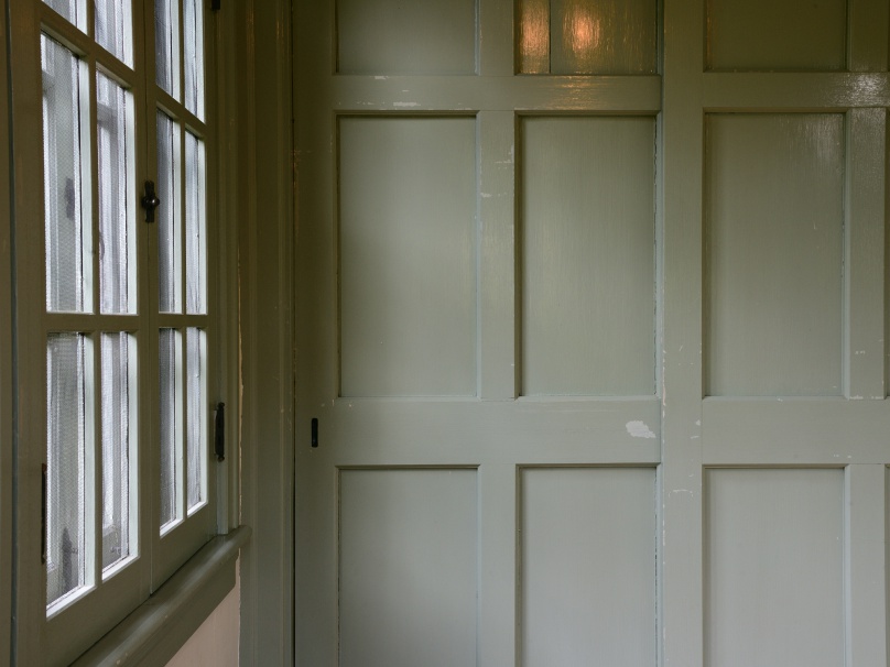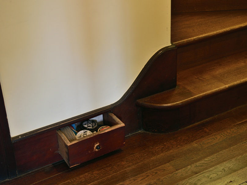 屋根裏などの大スペースはもちろん、ちょっとしたスペースを見逃さず上手に活用するのが、ヴォーリズのすごいところ。こちらは廊下の壁面下部に設けられた小さな引き出し。靴磨きセットなどの小物を入れるためのもののようです。
