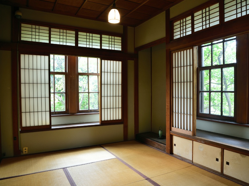 サンルームに続く和室の両側には出窓が設けられ、外からはここが和室であることがわかりにくくなっています。和室から臨む木々はカキをはじめ日本にゆかりのある植物に限定。実際に腰を下ろして外を眺めると、ここが洋館だとは思えないほど、和の情緒に包まれています。