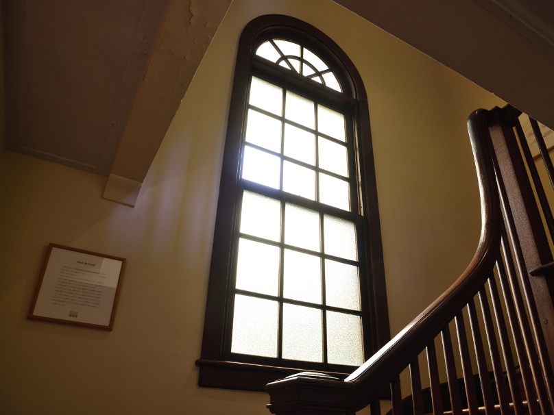 主棟でひときわ目を引くステンドグラスは、ヴォーリズが好んだ色を採用したといわれています。教会などにもよく使用され、夕方になるとステンドグラスからこぼれ落ちる光で黄金色に染まり、階段室一帯はさらに美しい空間へと変わります。