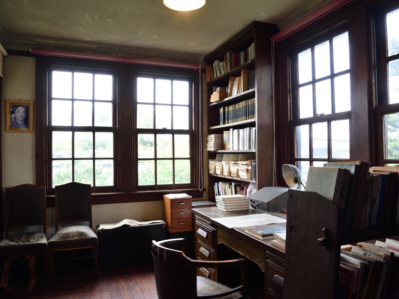 こちらは駒井博士の書斎。入り口のみ入室が可能です。普段は遮光カーテンが下ろされていますが、今回は特別に開けて撮影。博士はこの部屋で研究や執筆にいそしんでいたようです。