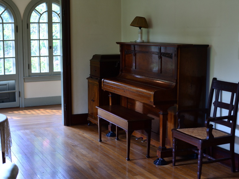 それでは駒井家住宅でぜひ注目したいポイントを2つご紹介します。まずは、夫妻のこだわりが感じられる家具です。館内にある居間のピアノや蓄音機、食堂のテーブルや椅子、食器棚や本棚などは、夫妻が実際に使用していたもの。ドイツ製のピアノは、結婚時に駒井博士が静江に贈ったものだそうで、レトロな空間になじんでいます。