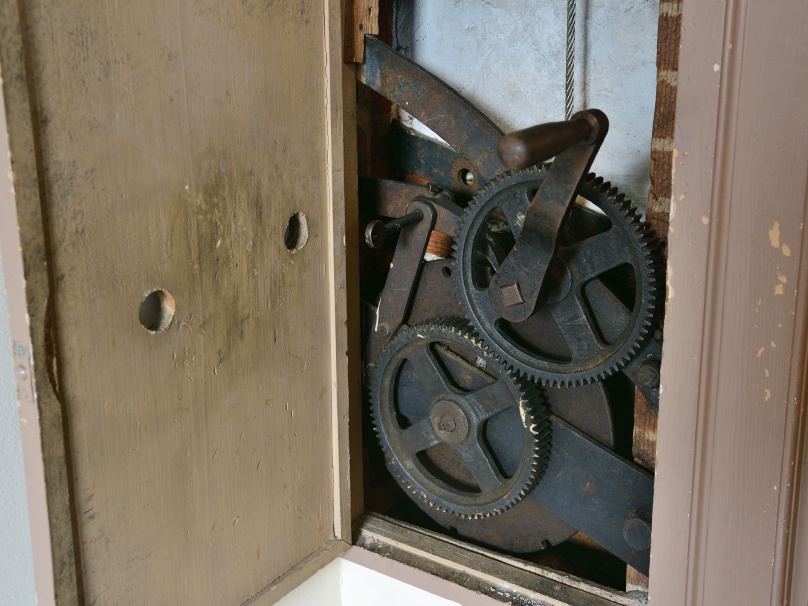 駒井家住宅が誇るべき特徴のひとつが「収納スペースの多さ」。空間を上手に活用して、収納が可能なスペースを生み出しています。そのひとつが、客室の入口すぐ脇にある歯車。スタッフの方にお願いして、特別に動かしてもらうと…。