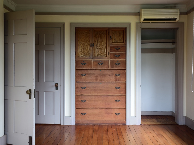2階寝室には作り付けのタンスがあります。こちらは元々の設計図とは少しデザインが異なるようで、静江が愛用していた着物を収納できるように作り替えたとか。右隣のクローゼットの下には小さな床下収納庫もあります。空間を無駄なく使うヴォーリズの優しい心遣いを感じられますね。こうした細かい所へのこだわりもぜひ注目してください。