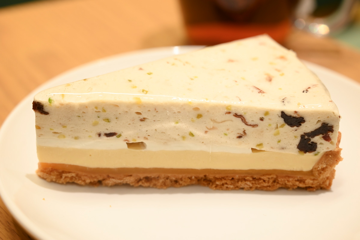ムースの軽やかな口当たりとともに、ドライフルーツの味わい、はちみつのやさしい甘み、甘酸っぱいアプリコットソースのさまざまな風味が口の中で広がります。生地のタルトの食感も加わって、口に運ぶたびに新しい発見がありました。
